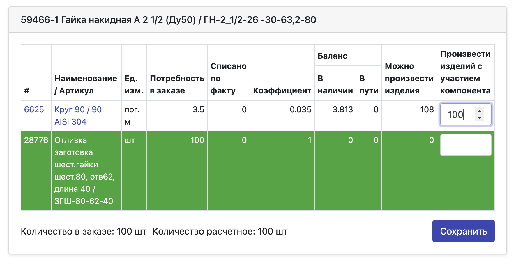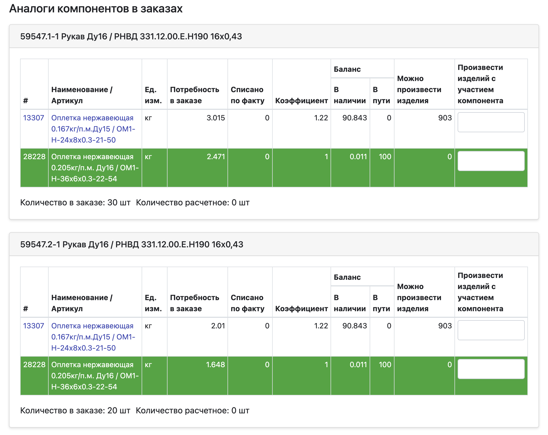 - можно произвести изделия. Количество изделия в заказе, которое можно произвести, исходя из количества компонентов в наличии согласно норморасхода, а также коэффициента пересчета аналога по отношению к основному компоненту,