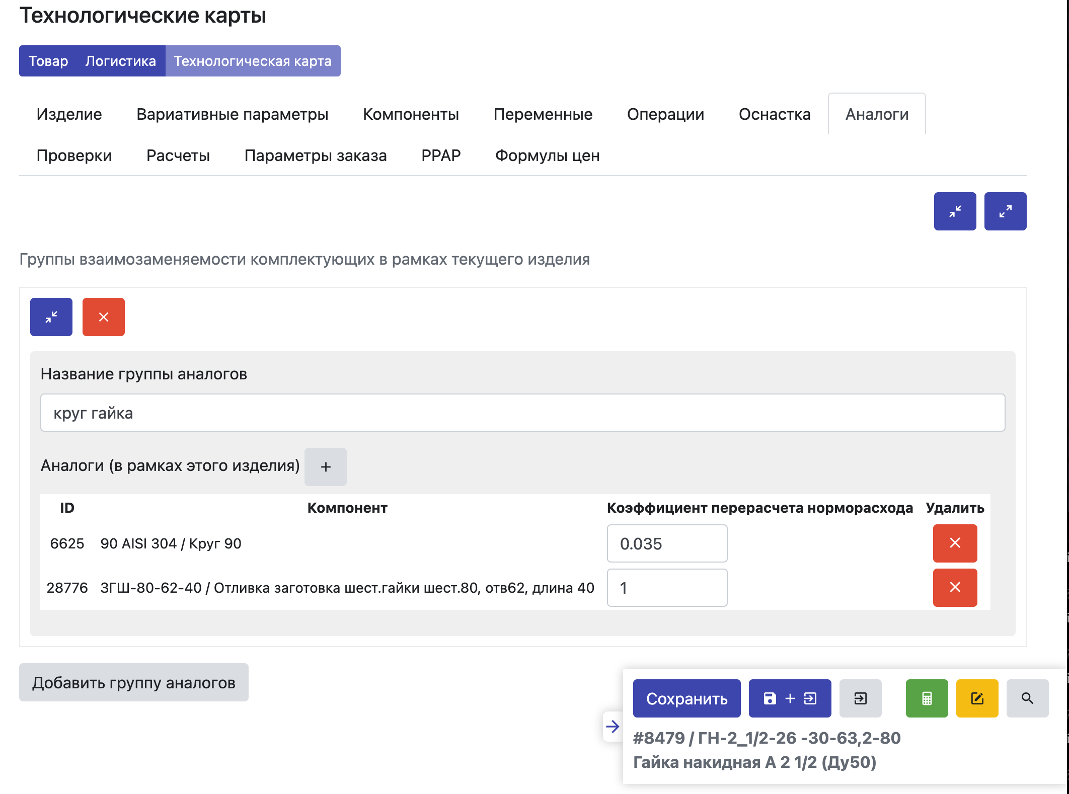 Инженер-технолог при редактировании технологической карты изделия переходит в раздел "Аналоги". В данном разделе он может создать одну или несколько групп аналогов для текущей технологической карты. При редактировании группы аналогов инженер технолог задаёт наименование группы, а также список компонентов и их аналогов в рамках производства данного изделия. Каждый компонент в списке аналогов представлен идентификатором, наименованием, артикулом, а также коэффициентом пересчета норморасхода. Коэффициент пересчета норморасхода определяет конечное количество компонента, которое необходимо будет при производстве изделия после замены основного компонента на его аналоги. То есть согласно данного рисунка если для производства одного изделия понадобится одна отливка, то при использовании круга 90 заготовку гайки можно изготовить из 3.5 миллиметра круга.