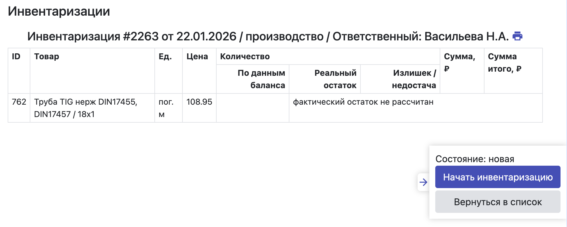 Для новой инвентаризации по компоненту пользователь видит таблицу с указанием товарно-материальной ценности в виде идентификатора, наименования, артикула, единицы измерения, текущего балансовую цену, а также сообщение о том, что не начат подсчет фактических количеств ТМЦ в инвентаризации.