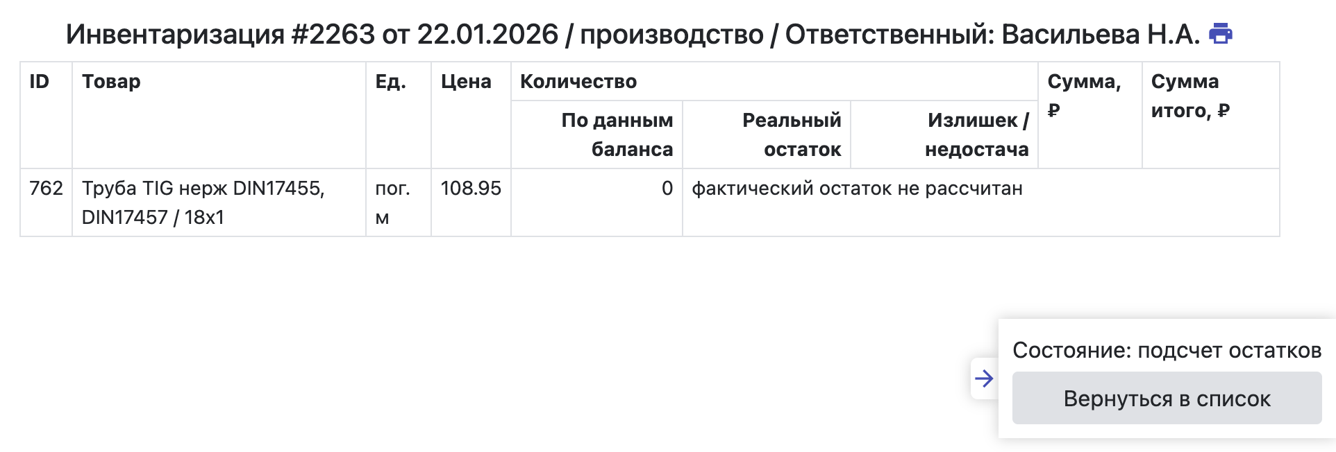 - Сообщение о том, что фактический остаток ТМЦ в инвентаризации не рассчитан.
