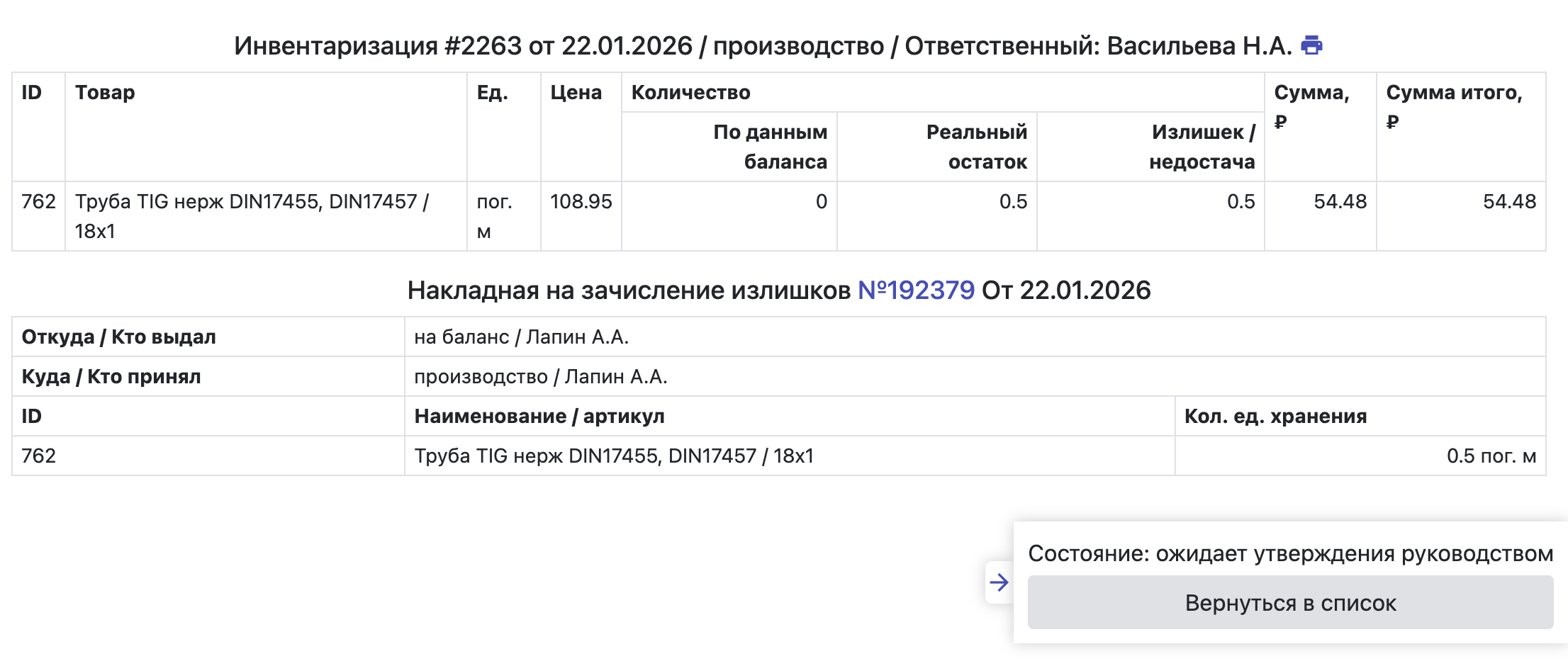 - Сумма. Сумма в рублях от расхождения остатков товарно-материальной ценности, полученная как текущая балансовая стоимость ТМЦ, помноженная на значение излишка / недостачи;