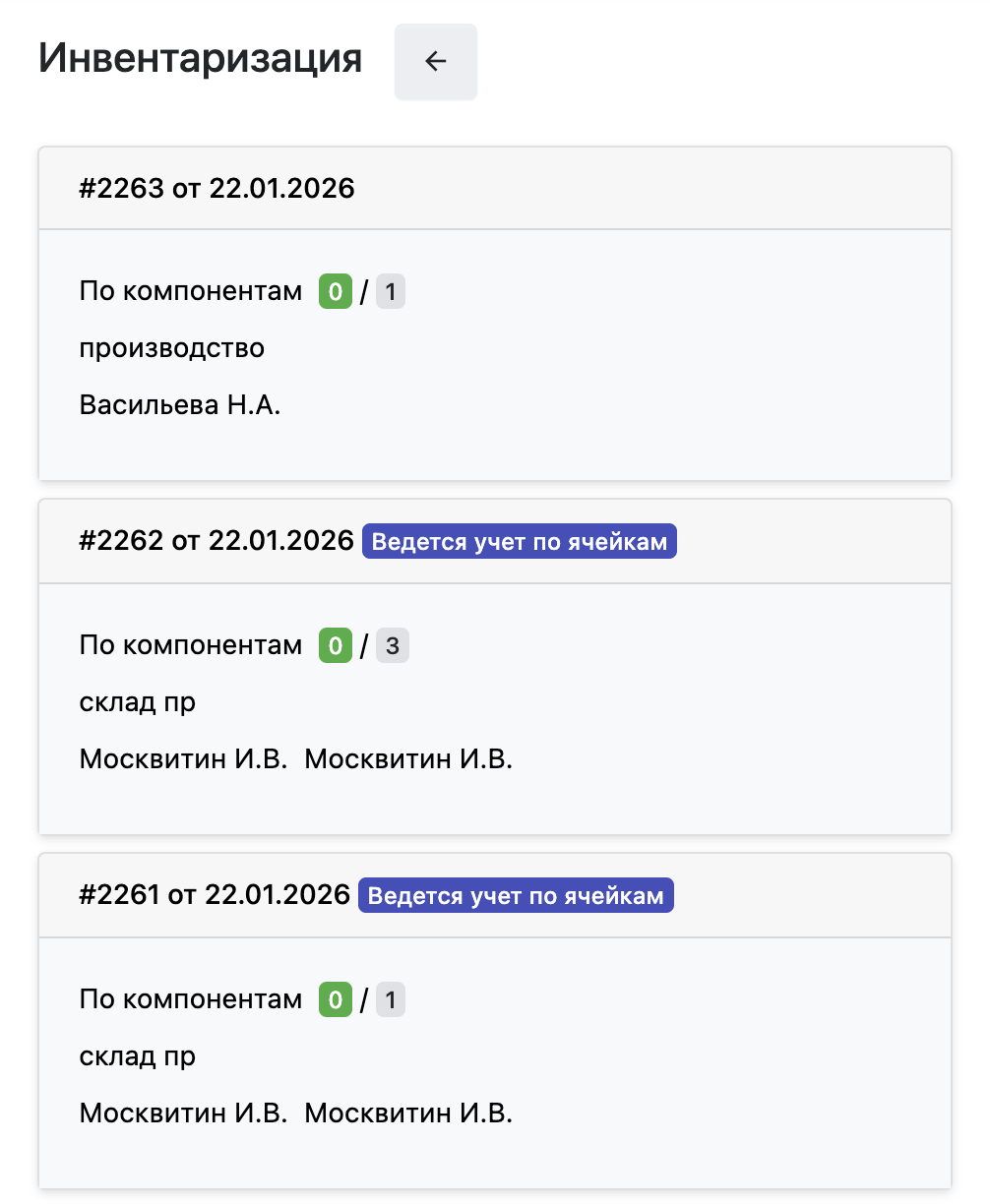 - Если на месте хранения инвентаризации ведётся адресное хранение, сообщение о том что "Ведётся учёт по ячейкам";