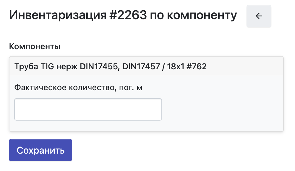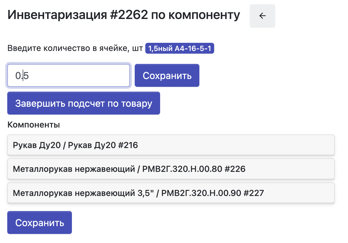 После того, как ячейка распознана системой по её QR-коду, сотруднику склада показывается поле ввода для указания фактического остатка выбранной ТМЦ в выбранной ячейке. Кладовщик на клавиатуре ТСД вводит фактическое количество ТМЦ в выбранное ячейке, нажимает кнопку "Сохранить", и информация о количестве ТМЦ в указанной кладовщиком ячейке сохраняется в памяти компьютера. ТСД переходит в режим сканирование QR-кода следующие ячейки для ранее выбранного кладовщиком ТМЦ.