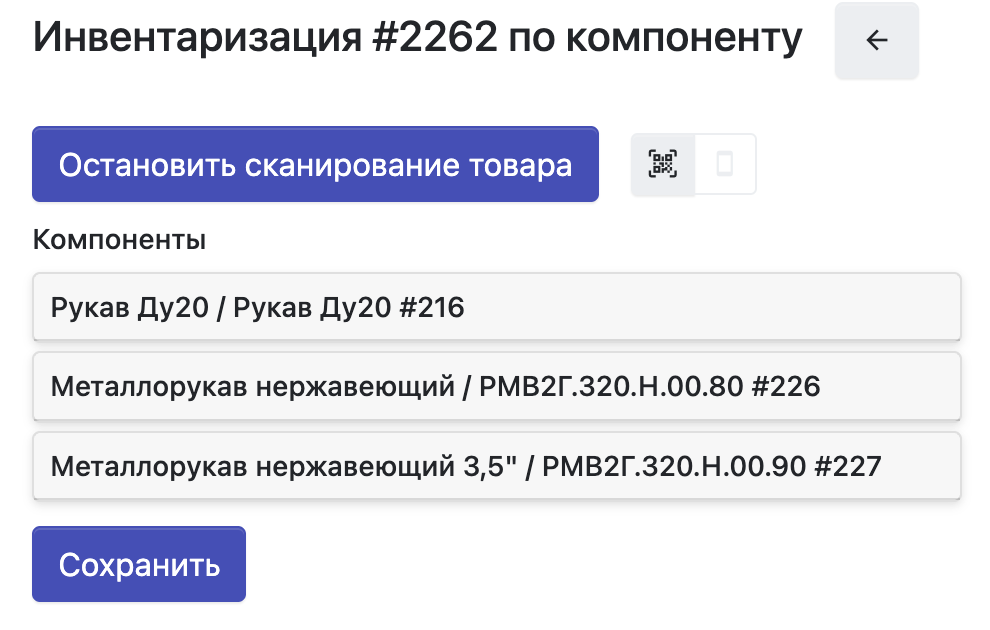 Если в месте хранения инвентаризации ведётся адресное хранение, кладовщик обязан сначала отсканировать QR-код одной из ТМЦ в инвентаризации. Режим сканирования QR-кода товара включается автоматически после входа кладовщиком в инвентаризацию.