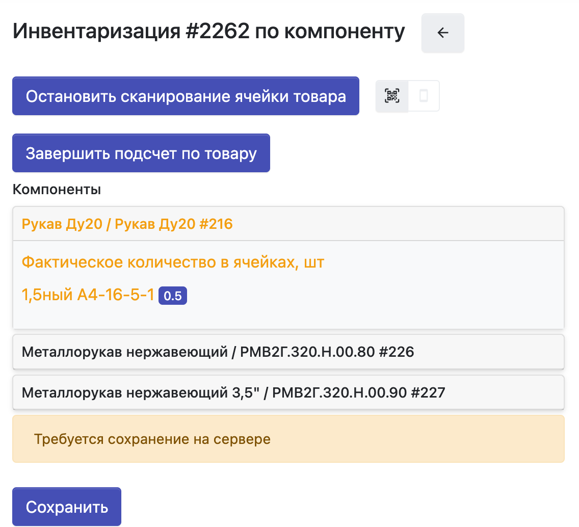Если ТМЦ нет больше ни в каких ячейках на указанном в инвентаризации месте хранения, сотрудник склада может нажать кнопку "Завершить подсчет по товару". ТСД переходит в режим сканирования QR-кода следующей ТМЦ в инвентаризации. При этом в списке ТНЦ по инвентаризации показан список распределения фактических остатков ТМЦ с завершенным подсчетом по ячейкам. Ниже списка ТМЦ в инвентаризации в этом случае кладовщик видит сообщение о том, что данные на ТСД требуют сохранения на сервере (в системе).