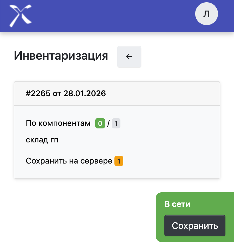 В списке инвентаризаций в случае, если в текущий момент на ТСД есть инвентаризации, требующие сохранения данных в системе, в карточке каждой такой инвентаризации указывается количество ТМЦ, подлежащих сохранению на сервере. В случае, если ТСД находится в зоне действия интернет, то есть есть возможность отправить данные на сервер, в правом нижнем углу появляется виджет, показывающий что ТСД находится в сети и содержащий кнопку "Сохранить". Нажатие кнопки "Сохранить" приводит к отправке данных в систему по инвентаризациям, требующим сохранения на сервере.